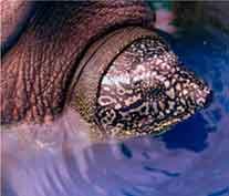 Uma característica peculiar nesse raríssimo animal é a sua cabeça profunda com olhos posicionados dorsalmente. O focinho lembra o de um porco.