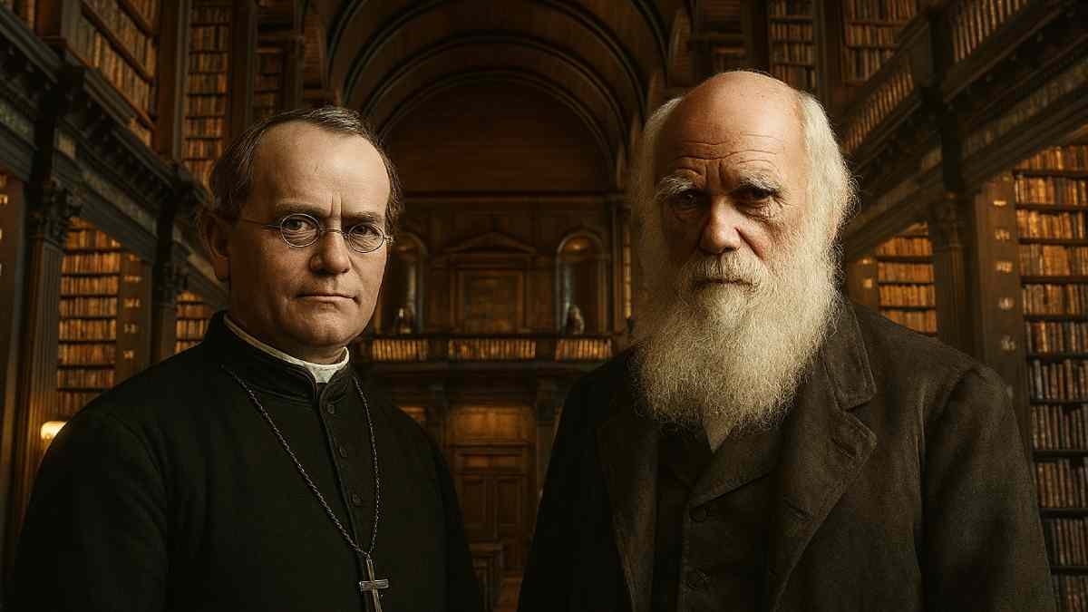 Síntese Moderna: um hipotético encontro entre Darwin e Mendel. Imagem gerada digitalmente