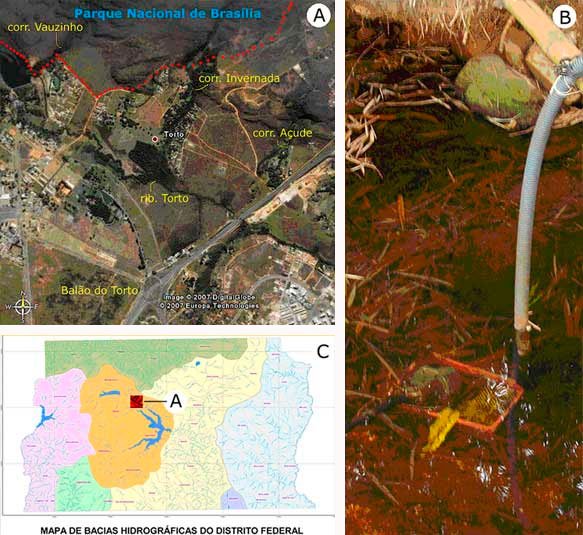 Por mais insignificante que possa parecer sua captação de água, lembre-se que provavelmente não é a única (Figura 4). Antes colocar a bomba no riacho, é importante que seja feito um plano envolvendo todos os usuários, identificando os tipos de uso da água e as implicações para sua qualidade e quantidade naquele corpo de água. Mesmo captações consideradas insignificantes devem ser cadastradas. No Distrito Federal, quem faz este cadastro é a Sub-secretaria de Recursos Hídricos, vinculada à Secretaria de Desenvolvimento Urbano e Meio Ambiente, todos os formulários podem ser obtidos no Portal do GDF, na internet.