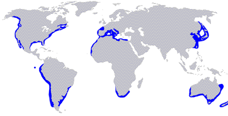 Mapa da presença do tubarão branco (Carcharodon carcharias) nos oceanos.